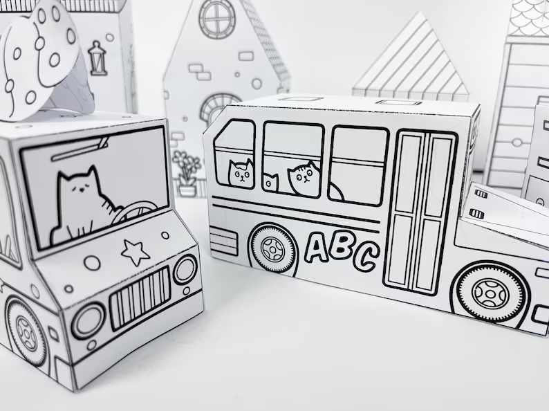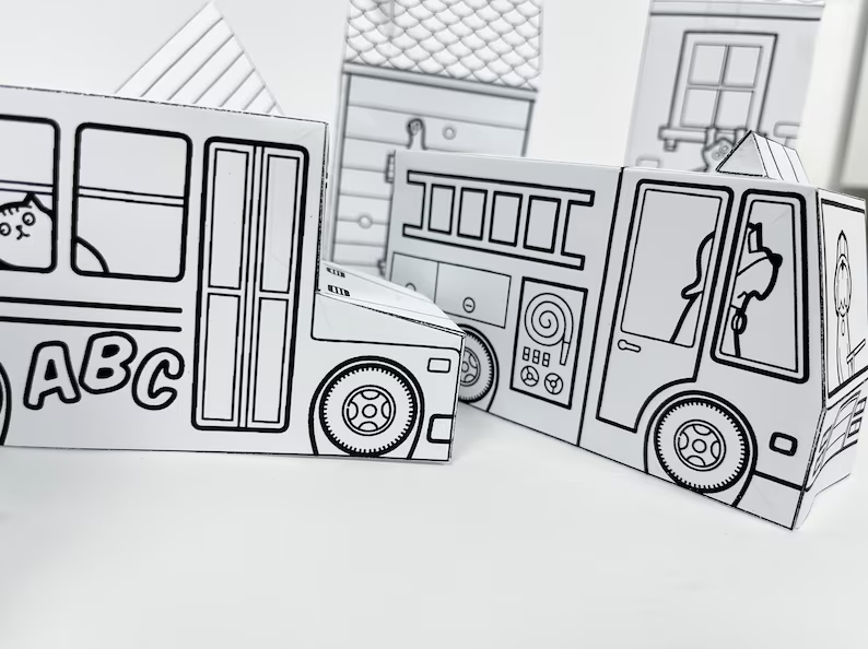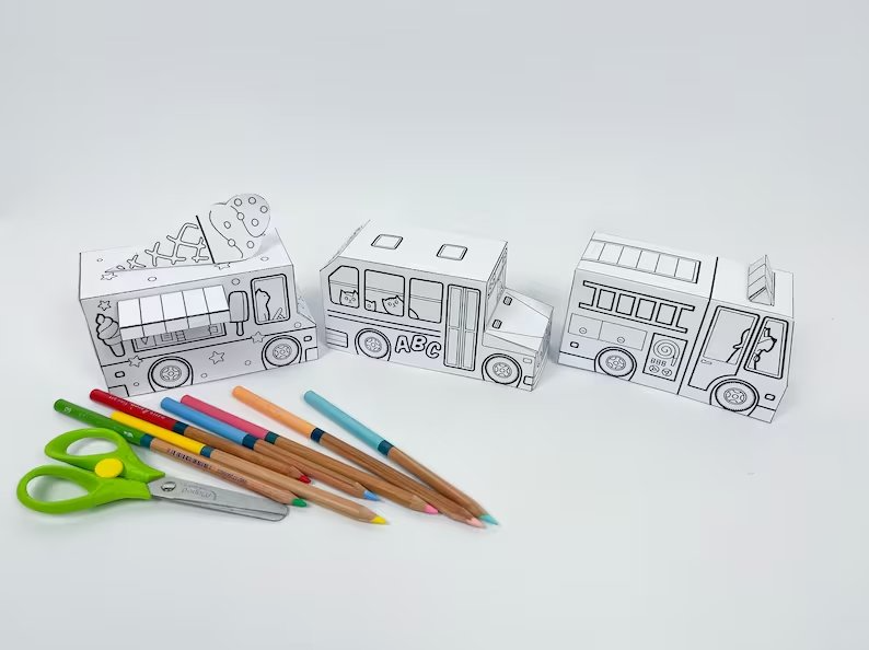 Agora seus filhos, sobrinhos ou netos poderão se divertir pintando, colorindo e montando esta coleção de caminhões em papel (Caminhão de Sorvete, Ônibus Escolar, Bombeiros, Pássaros e Casas)